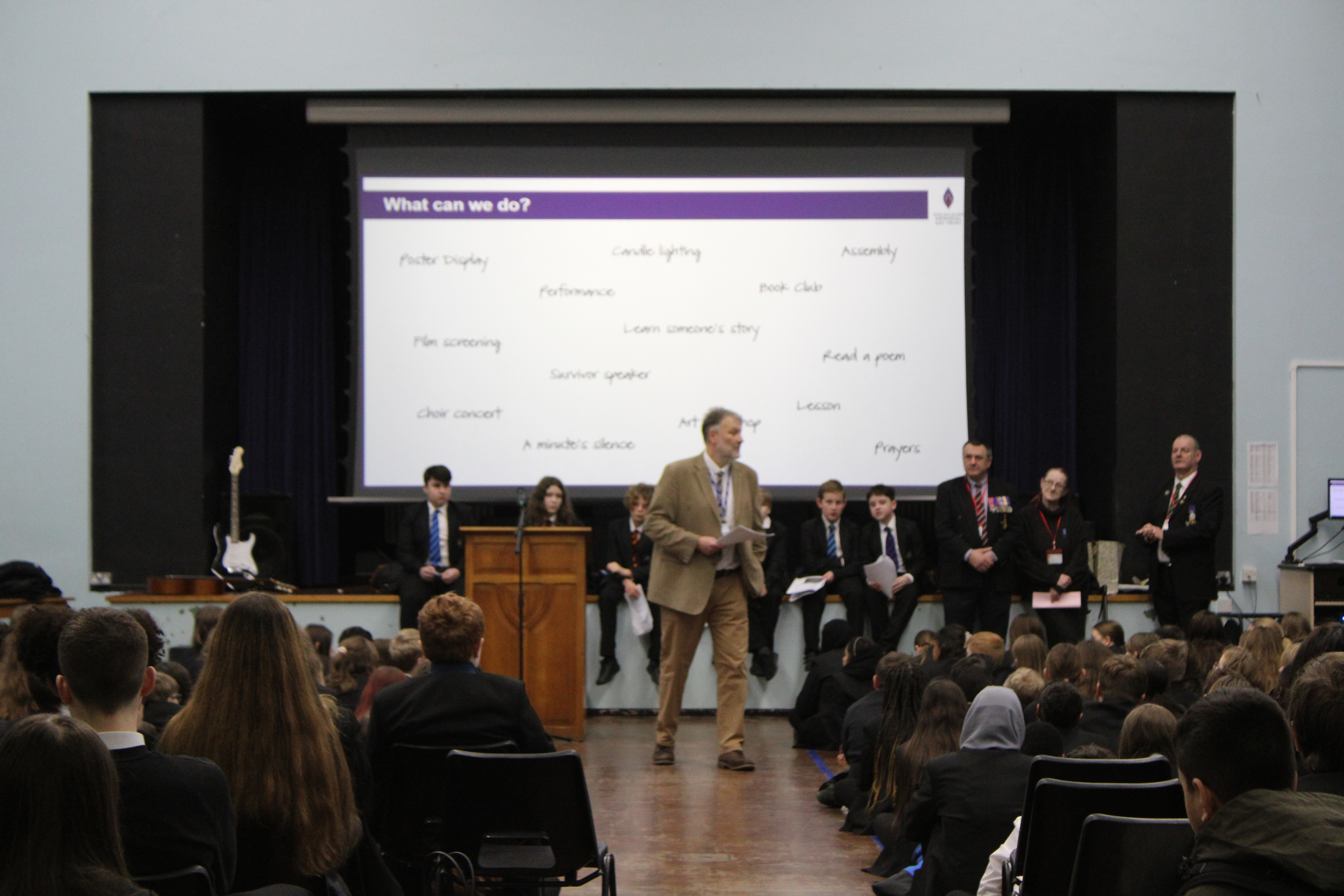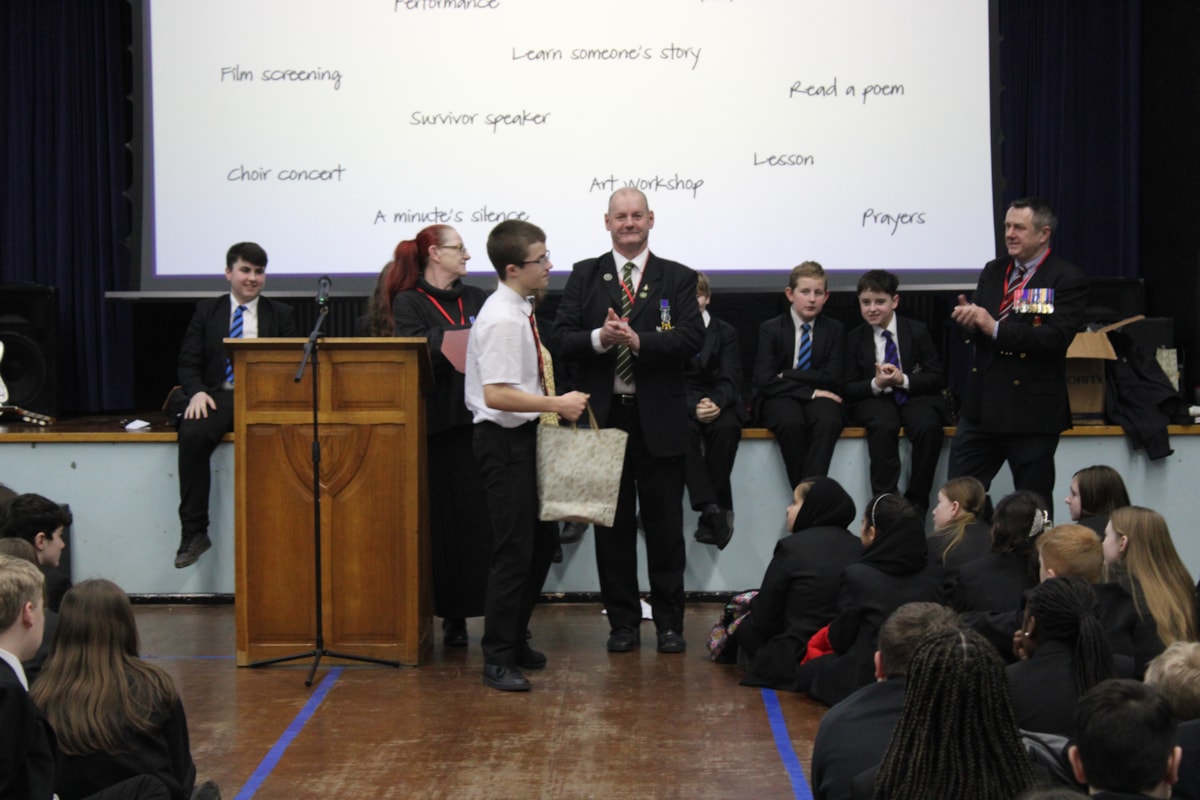 Joining the school community were three members of the Garrison Veterans’ Catterick Historical Archive Group: Veterans Mark Hill MBE, Paula Rogers, and Pete Wine. Pupils delivered a confident and educational presentation, their research and heartfelt words ensuring the victims of the Holocaust were never forgotten. Veteran Pete Wine's unique perspective, gained from visiting Bergen-Belsen in the 1980s, added further depth to the occasion.